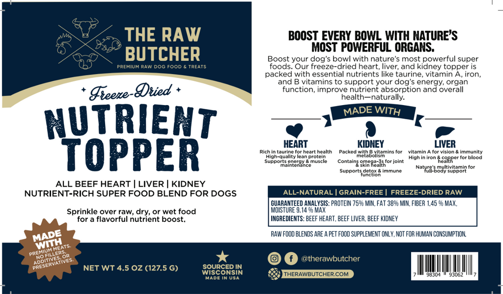 The Raw Butcher Freeze-Dried Raw Dog Food Taste Enhancer features freeze-dried, USDA-inspected Beef Liver, Beef Heart, Beef Kidney with no additives, preservatives, or fillers for the perfect flavor profile for your pet.